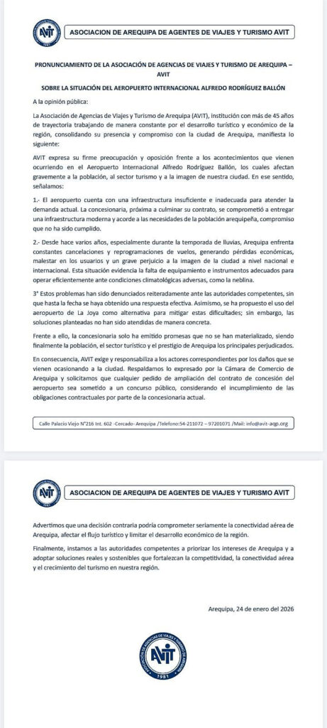 Finalmente, AVIT advirtió que una decisión contraria podría comprometer seriamente la conectividad aérea de Arequipa, afectar el flujo turístico y limitar el desarrollo económico regional, por lo que instó a las autoridades a adoptar soluciones reales y sostenibles.