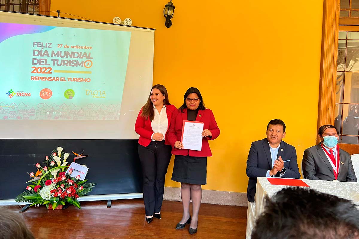 La Dirección Regional de Comercio Exterior y Turismo de Tacna entregó un reconocimiento con Resolución Directoral Regional N° 017- 2022-DIRCETUR/GOB.REG.TACNA a la Asociación Peruana de Hoteles, Restaurantes y Afines (Ahora Tacna), representada por su presidenta Mey Lin Mori Chambe, por el compromiso con el desarrollo del sector turismo en la región Tacna.
