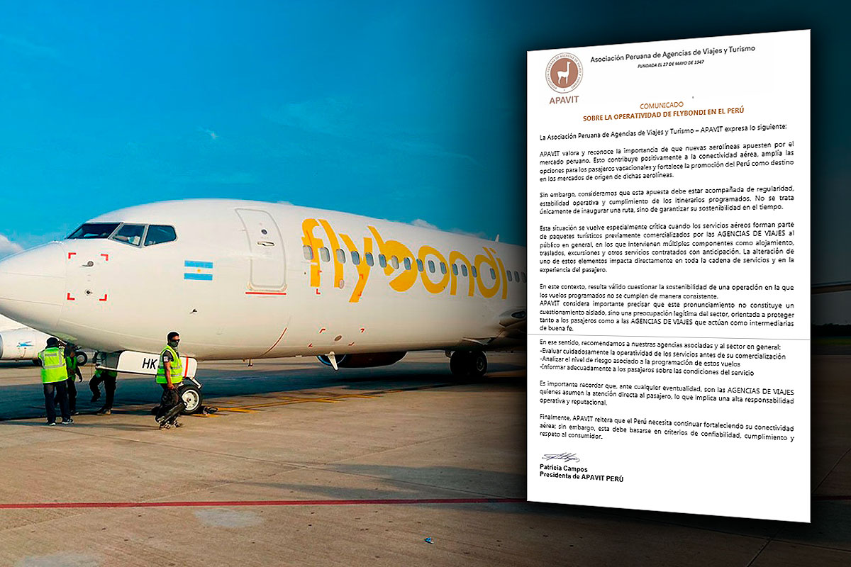 La Asociación Peruana de Agencias de Viajes y Turismo (Apavit) expresó su preocupación por la operatividad de la aerolínea Flybondi en el mercado peruano, al considerar que la falta de cumplimiento consistente de los vuelos programados pone en riesgo la cadena de servicios turísticos.