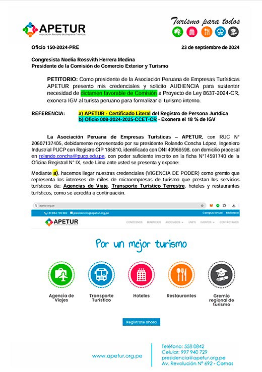 En una carta dirigida a la Comisión de Comercio Exterior y Turismo del Congreso, la Asociación Peruana de Empresas Turísticas (Apetur) expresó su respaldo al Proyecto de Ley N° 8637-2024-CR, que propone la exoneración del IGV para los servicios turísticos ofrecidos a los peruanos y facilitar el acceso al turismo a las poblaciones más vulnerables.