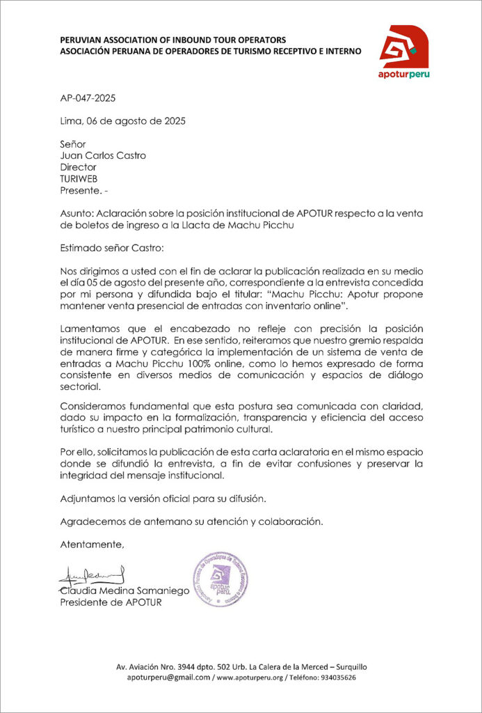 La misiva, firmada por la presidenta del gremio, Claudia Medina Samaniego, responde a la nota publicada el 5 de agosto titulada “Machu Picchu: Apotur propone mantener venta presencial de entradas con inventario online”, basada en la entrevista difundida ese mismo día por nuestro medio.