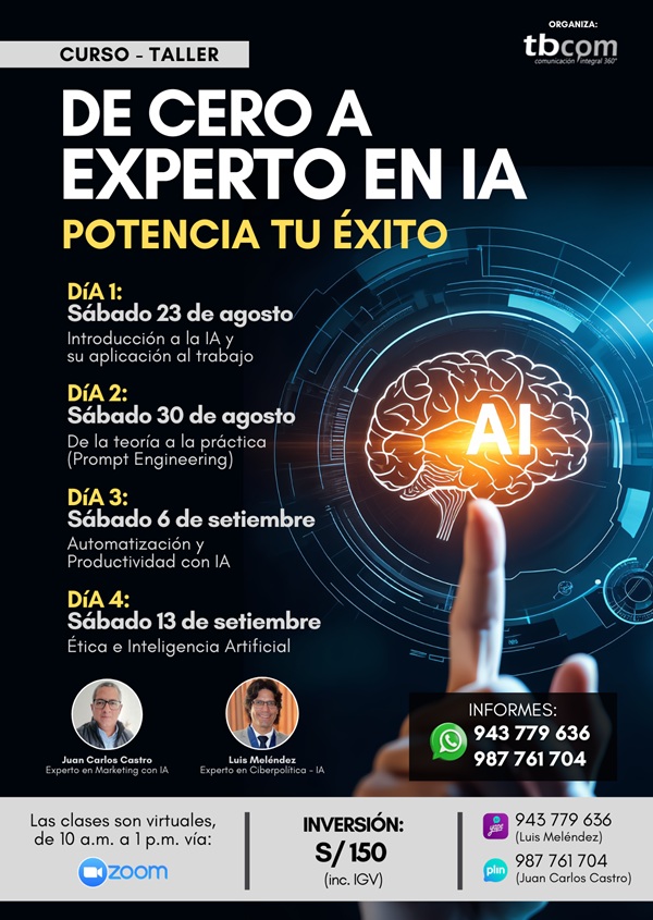 Dictado por Juan Carlos Castro, experto en marketing digital con IA, y Luis Meléndez, especialista en ciberpolítica e IA, el programa cubre:
