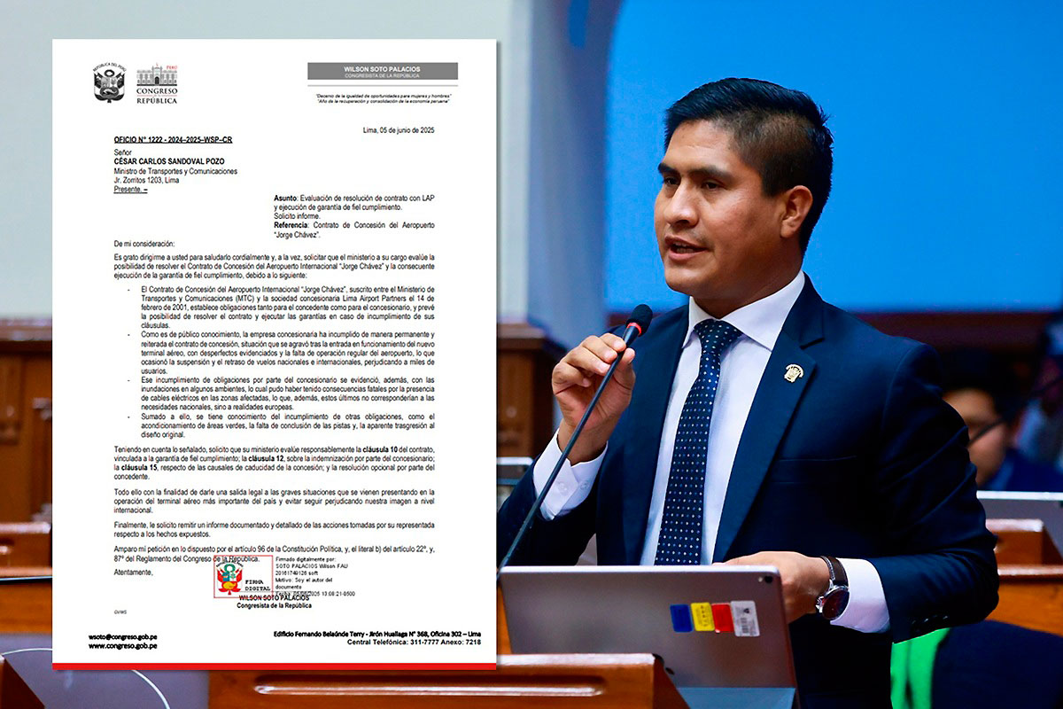 El congresista Wilson Soto Palacios remitió hoy el Oficio N.° 1222-2024–2025–WSP–CR al ministro de Transportes y Comunicaciones, César Sandoval Pozo, solicitando formalmente que se evalúe la posibilidad de resolver el contrato de concesión con la empresa Lima Airport Partners (LAP) por el manejo del Aeropuerto Internacional Jorge Chávez.