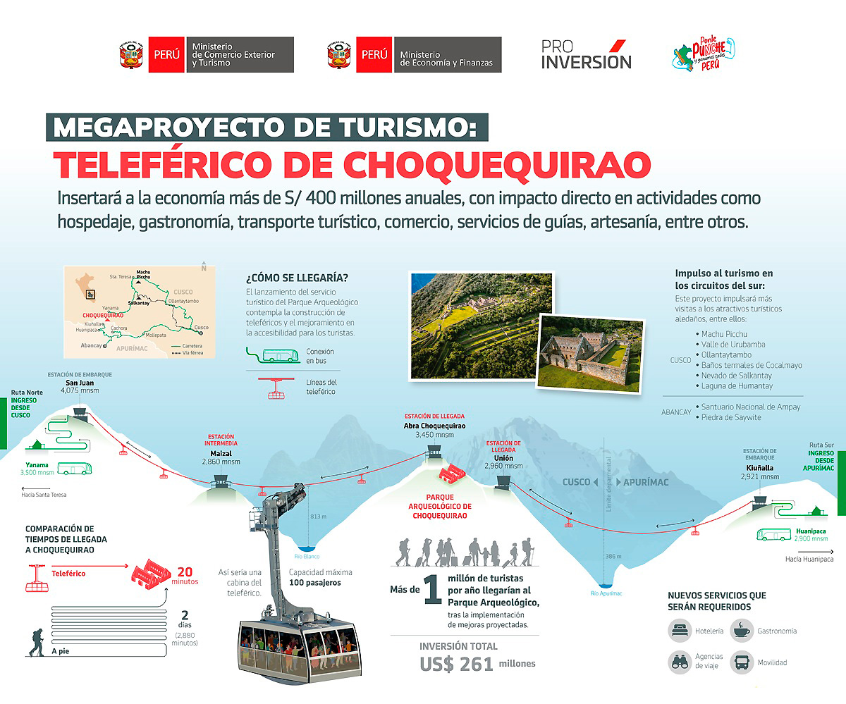 El proyecto denominado “Mejoramiento de los Servicios Turísticos Públicos del Parque Arqueológico Choquequirao” tiene una inversión estimada de US$ 261 millones y prevé atraer a más de un millón de visitantes al año, ya que se reducirá el tiempo de viaje de más de dos días a solo 20 minutos mediante un moderno sistema de transporte por cable de más de 10.6 kilómetros de longitud, que conectará varios tramos desde ambas regiones involucradas.