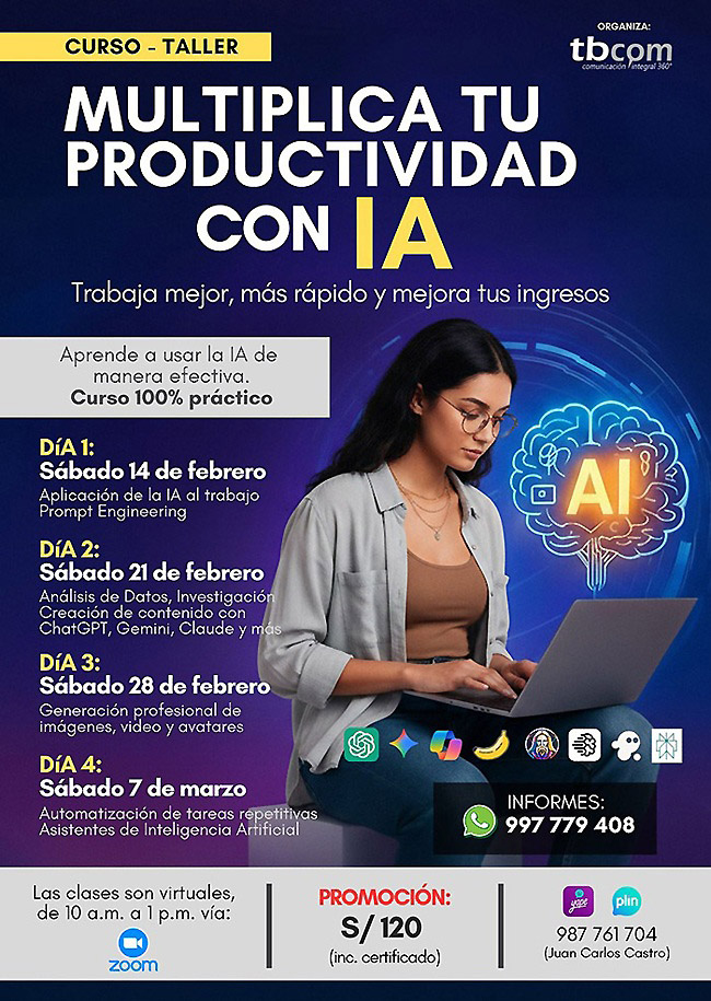 Ante el avance acelerado de la inteligencia artificial en el entorno laboral y empresarial, TBCOM y Turiweb lanzaron el curso-taller “Multiplica tu Productividad con IA”, una capacitación práctica orientada a enseñar cómo utilizar herramientas de inteligencia artificial generativa para trabajar mejor, más rápido y con mayor eficiencia.