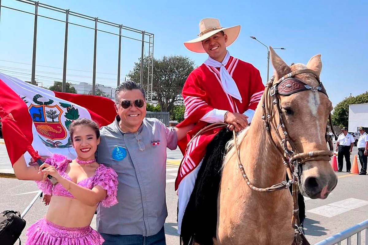 El joven Mariano Dongo, que lució un poncho rojo y blanco tejido a mano por artesanas lambayecanas, presentó un espectáculo de marinera norteña con caballo de paso, y portó en la mano el pabellón nacional, signo de nuestra identidad nacional.