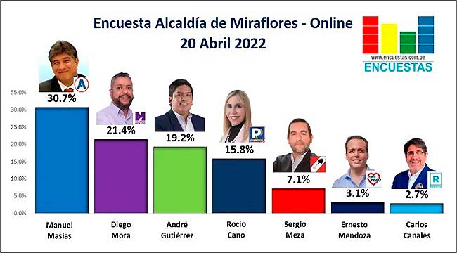 El municipio de Miraflores es uno de los más disputados del país, con 11 partidos inscritos para las próximas elecciones del 2 de octubre. Por ahora, el ex alcalde Manuel Masías lidera las encuestas preliminares con un 30% de la intención de voto, según el portal Encuestas.com.pe.
