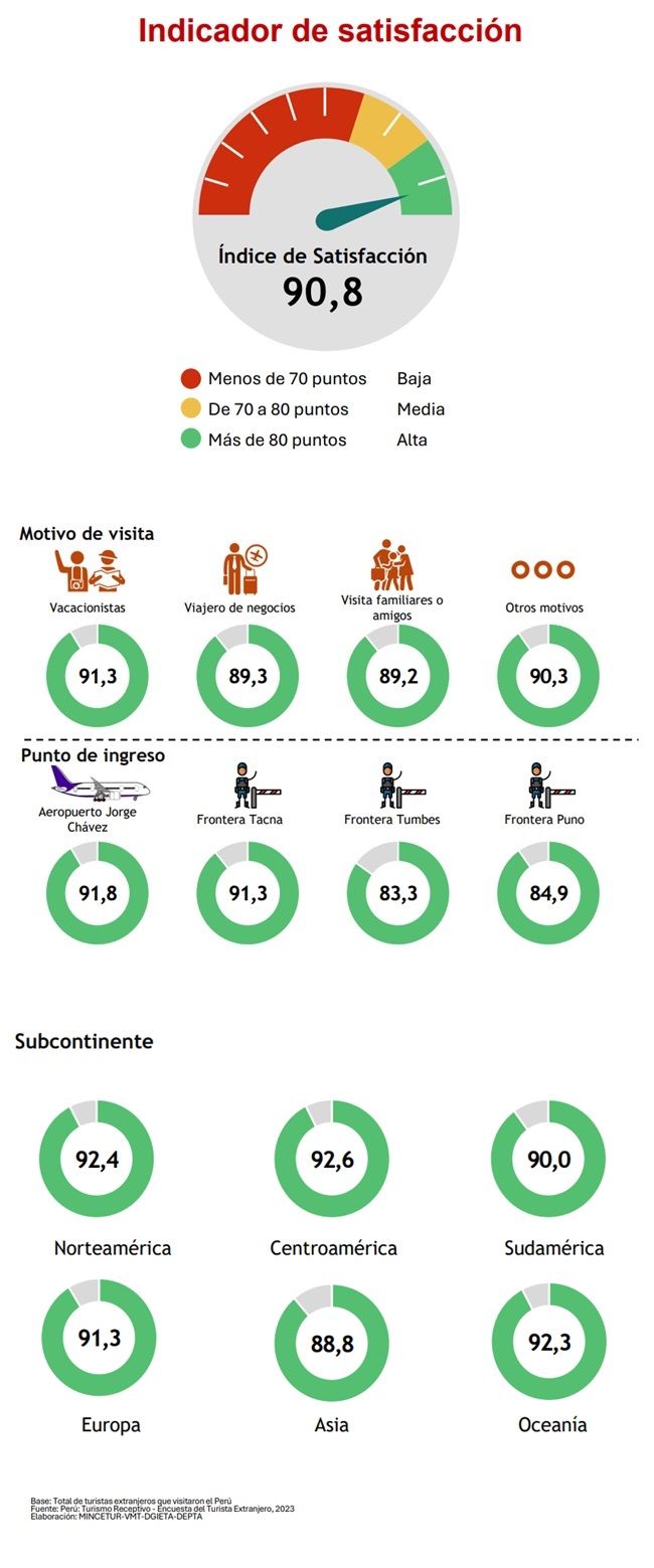 De acuerdo con la Encuesta del Turista Extranjero 2023, realizada por el Ministerio de Comercio Exterior y Turismo (Mincetur), el indicador de satisfacción de los turistas internacionales con su visita al Perú alcanzó un notable puntaje de 90,8, reflejando una experiencia mayormente positiva.