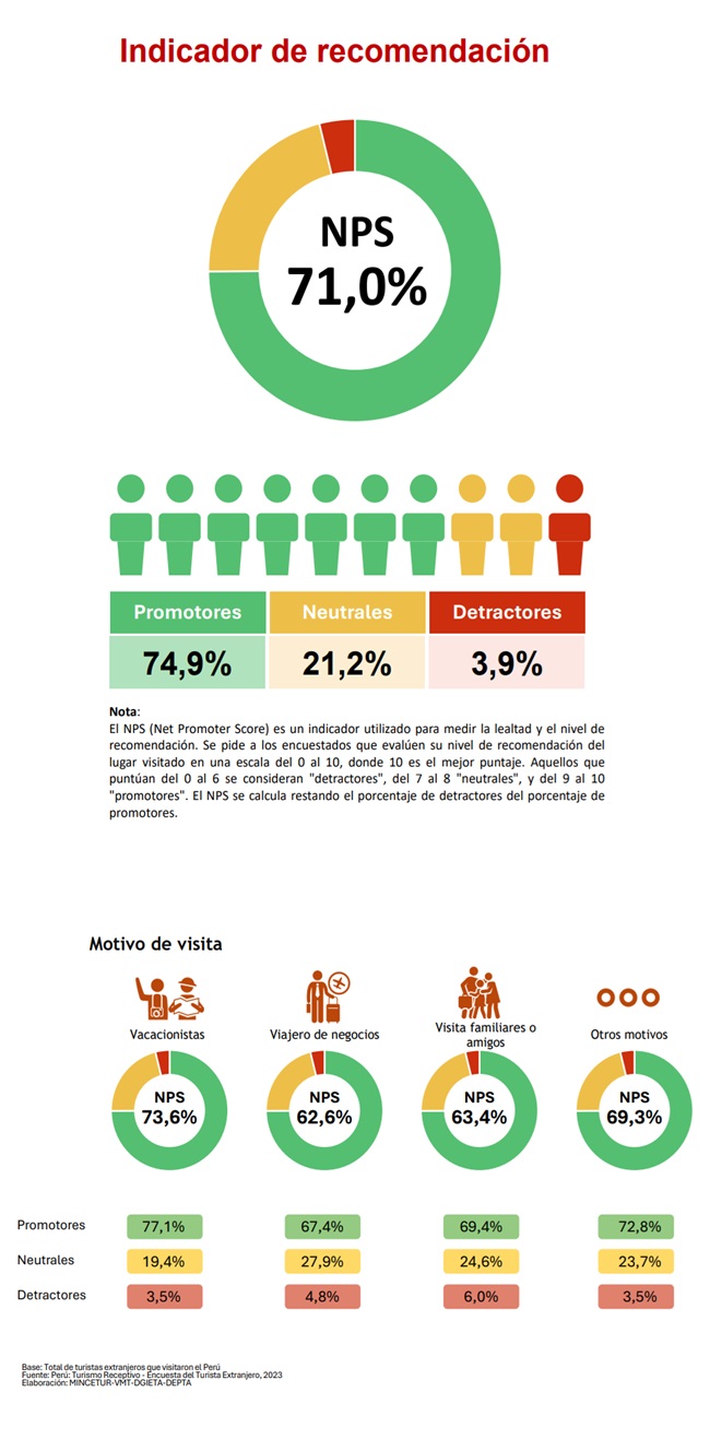En tanto, el indicador de recomendación del destino Perú alcanzó un 71%. Del total de turistas extranjeros, el 74,9% recomendó el país, mientras que solo el 3,9% no lo consideró recomendable.