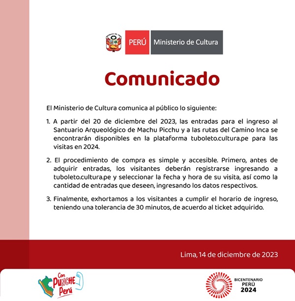 El Ministerio de Cultura confirmó hoy que, a partir del 20 de diciembre de 2023, las entradas para el ingreso al Santuario Arqueológico de Machu Picchu y a las rutas del Camino Inca se encontrarán disponibles en la plataforma: tuboleto.cultura.pe, gestionada por la empresa Joinnus, para las visitas en 2024.