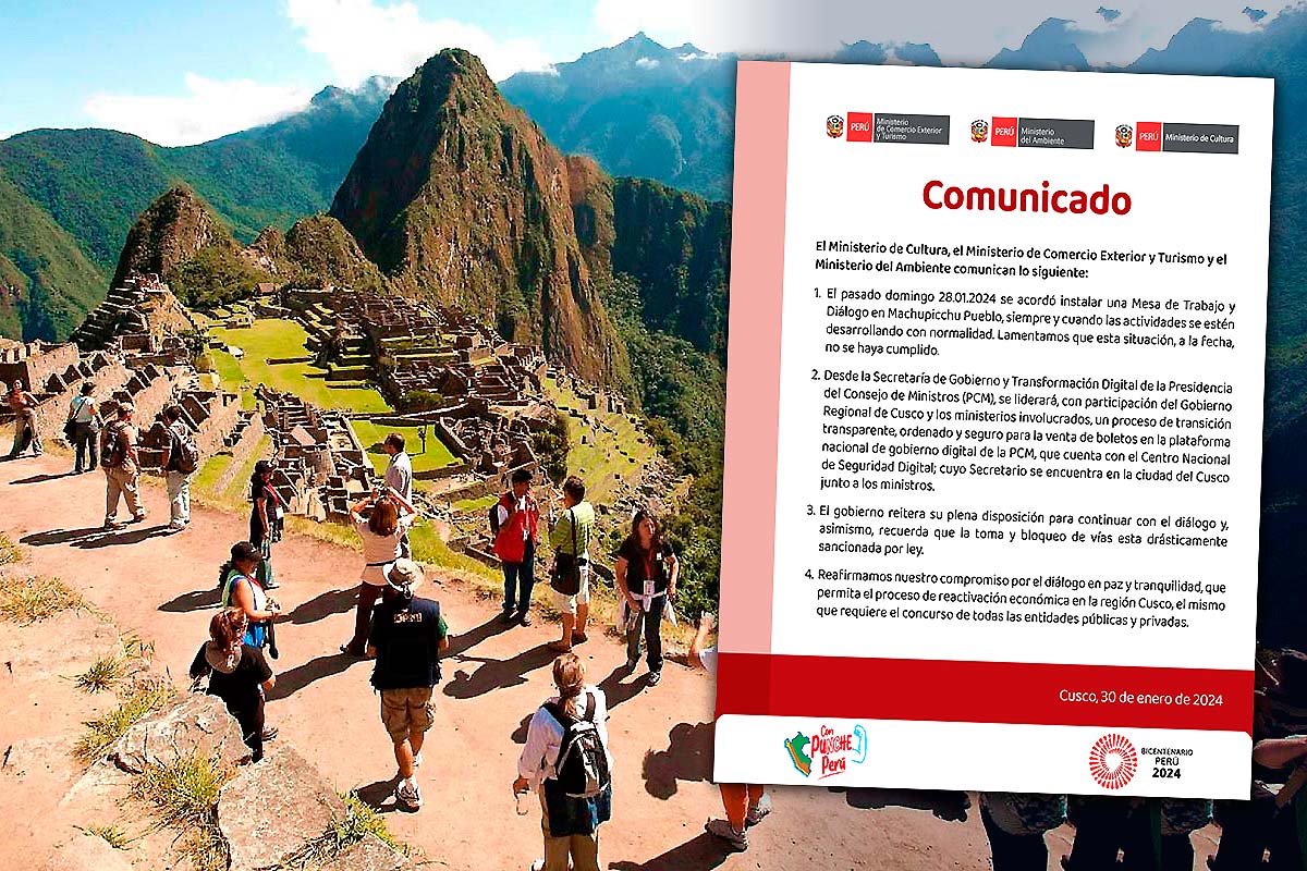 “El pasado domingo 28 de enero se acordó instalar una mesa de trabajo y diálogo en Machu Picchu Pueblo, siempre y cuando las actividades se estén desarrollando con normalidad. Lamentamos que esta situación, a la fecha, no se haya cumplido”, subraya el comunicado.