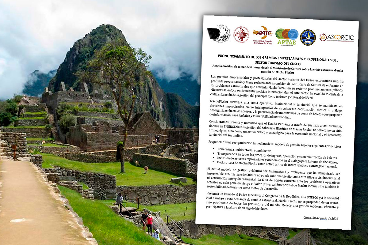 Los principales gremios empresariales y profesionales del sector turismo del Cusco emitieron un pronunciamiento conjunto en el que expresan su “profunda preocupación y firme rechazo” frente a lo que consideran la omisión del Ministerio de Cultura para abordar los problemas estructurales en la gestión de Machu Picchu.