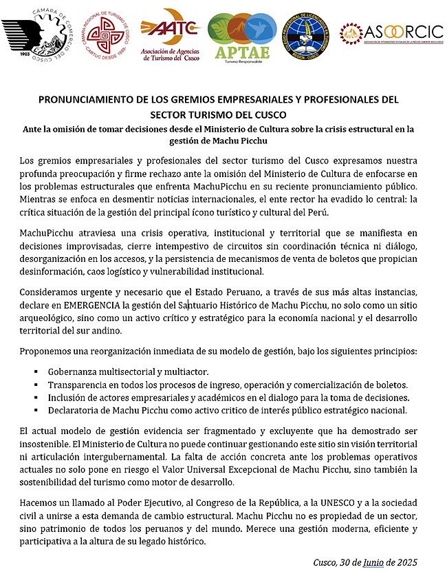El pronunciamiento es firmado por la Cámara de Comercio del Cusco, Cámara Regional de Turismo de Cusco (CARTUC), Asociación de Agencias de Turismo de Cusco (AATC), Asociación Peruana de Turismo de Aventura, Ecoturismo y Turismo Responsable (APTAE), Colegio de Licenciados de Turismo de Cusco y la Asociación de Operadores Oficiales de la Red de Camino Inca (ASOORCIC).