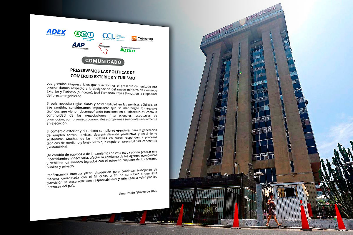 Diversos gremios empresariales país solicitaron que se mantengan los equipos técnicos y la continuidad de los lineamientos en el Ministerio de Comercio Exterior y Turismo (Mincetur), tras la designación de José Fernando Reyes Llanos como nuevo titular del sector, en la etapa final del presente gobierno.