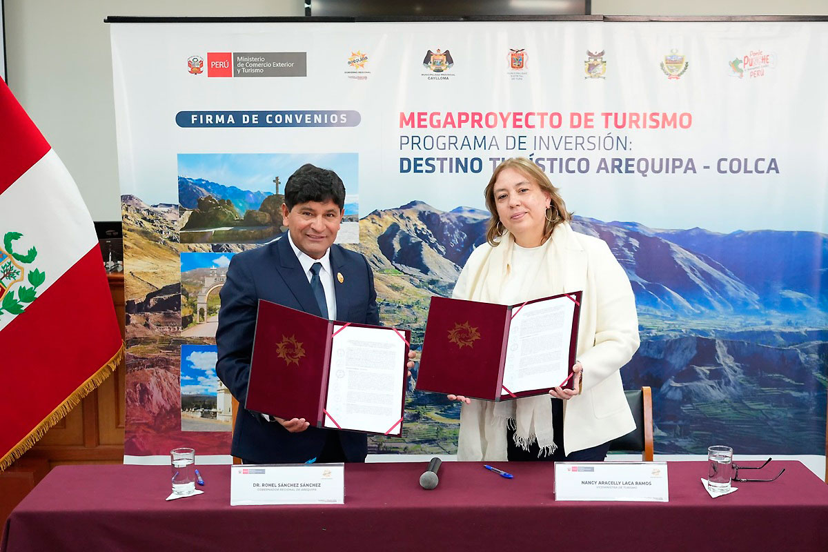 Con el fin de consolidar el departamento de Arequipa como un destino turístico estratégico del país, el Ministerio de Comercio Exterior y Turismo (Mincetur) suscribió esta tarde cinco convenios de cooperación con el Gobierno Regional, la municipalidad provincial de Caylloma, y las municipalidades distritales de Yura, Maca y San Juan de Tarucani; y presentó el Programa de Inversión “Fortalecimiento del Destino Turístico Priorizado Arequipa – Colca”, que prevé una inversión S/ 331 millones.