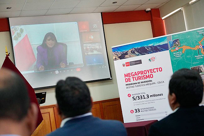 La ministra de Comercio Exterior y Turismo, Desilú León, participó de manera virtual en la ceremonia de suscripción de acuerdos, que fueron suscritos por la viceministra de Turismo, Aracelly Laca Ramos; con el gobernador regional de Arequipa, Rohel Sánchez Sánchez; el alcalde provincial de Caylloma, Alfonso Mamani Quispe; y los alcaldes distritales de Yura, Mirtha Mavel Ruelas Casillas; de Maca Jacinto Chicana Quispe; y de San Juan de Tarucani, Floro Choque Vilca.