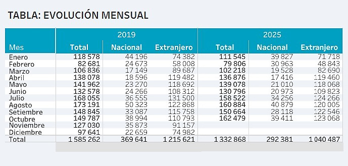 El análisis por tipo de visitante muestra que la recuperación ha sido desigual. Según cifras del Ministerio de Cultura, el turismo receptivo alcanzó los 1,040,487 turistas extranjeros en los diez primeros meses del presente año, lo que equivale al 99.1% de los registros de 2019 (1,049,482).