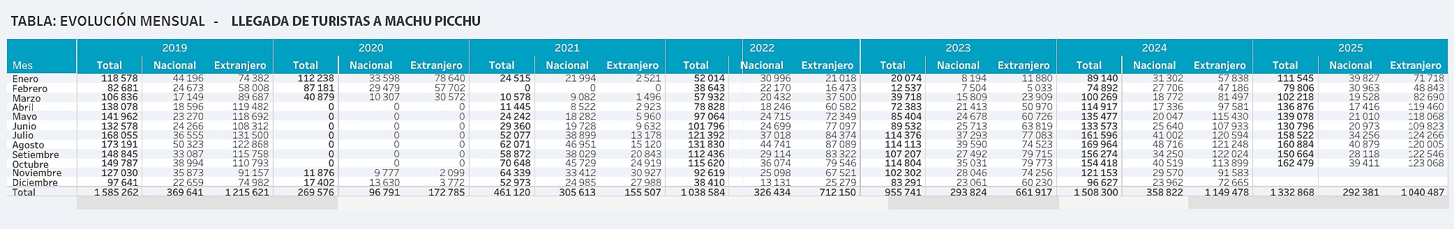 Esta evolución evidencia que, si bien la recuperación ha sido progresiva y a veces irregular, Machu Picchu sigue consolidándose como uno de los destinos más atractivos de América Latina. Las cifras de 2025 hasta octubre confirman esta tendencia, aunque aún falta recuperar por completo el volumen de turistas nacionales. En general, podríamos cerrar el año bordeando los niveles de 2019.