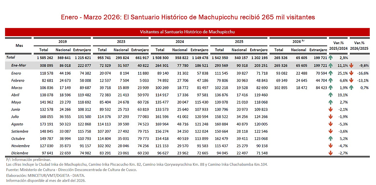 En el primer trimestre de 2026, el Santuario Histórico de Machu Picchu registró 265,326 visitantes, lo que significó una disminución de 9,6% (equivalente a 28 mil visitantes menos) en comparación con el mismo periodo de 2025. Asimismo, registró una caída de 13,9% frente a las cifras prepandemia (enero – marzo 2019).