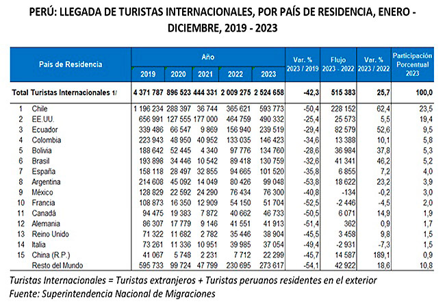 Durante el año 2023 ingresaron 2,524,658 turistas internacionales al Perú, lo que representa un crecimiento de 25,7% respecto al 2022, superando así las proyecciones iniciales del Ministerio de Comercio Exterior y Turismo (Mincetur).