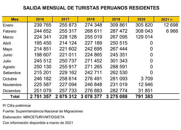 Entre enero y febrero, apenas 19,664 turistas peruanos salieron del país a destinos como Estados Unidos, Chile y el Caribe, reflejando una caída de 96.8% respecto al primer bimestre de 2020, cuando viajaron al exterior unos 613,863 compatriotas, previo al cierre de fronteras decretado en marzo por la pandemia.
