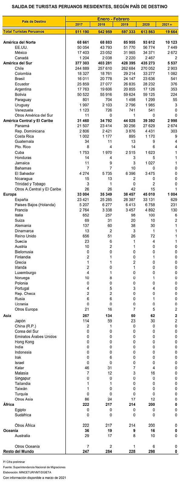De acuerdo con el Mincetur, los principales destinos de los turistas peruanos en estos dos primeros meses fueron: Estados Unidos (7,449 viajeros), Chile (2,903), Panamá (2,674), México (2,672) y Colombia (1,082). En el caso de República Dominicana, las autoridades de ese país (Aerodom) informan que entre enero y febrero recibieron un total de 2,165 turistas peruanos; en este periodo, Perú es el sexto mercado emisor de viajeros latinoamericanos a la isla.