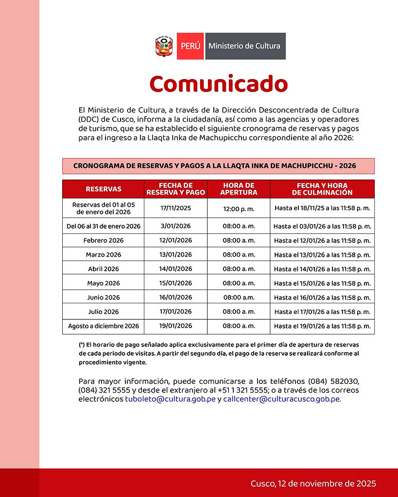 Adicionalmente, la DDC Cusco publicó el cronograma de pagos de las reservas anticipadas de la Red de Caminos Inca, correspondiente al año 2026.