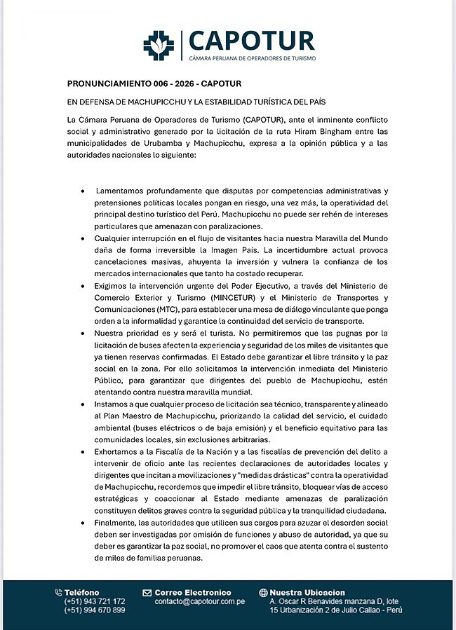 La Cámara Peruana de Operadores de Turismo (Capotur) exigió que la licitación del servicio de buses en la ruta Hiram Bingham hacia Machu Picchu se realice bajo criterios técnicos y de transparencia, en medio del conflicto generado entre las municipalidades de Machu Picchu Pueblo y Urubamba, el cual —advirtió— pone en riesgo la estabilidad del principal destino turístico del país.