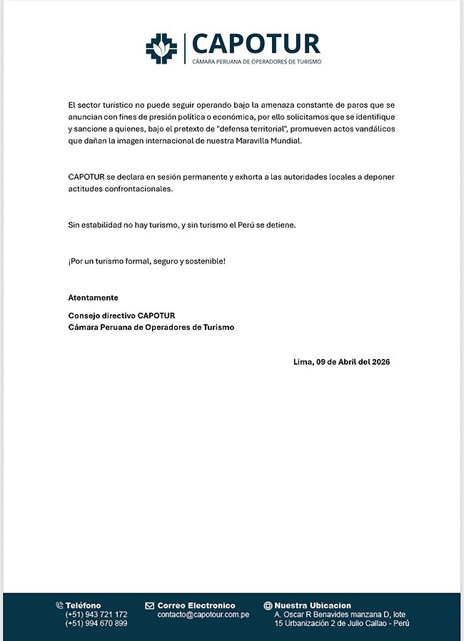 En paralelo, puso énfasis en la seguridad y experiencia del visitante. Señaló que las tensiones actuales no deben afectar a los turistas que ya cuentan con reservas confirmadas, por lo que instó al Estado a garantizar el libre tránsito y la paz social en la zona.