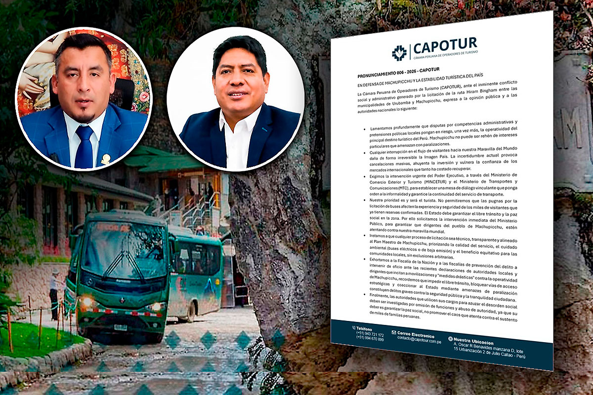 La Cámara Peruana de Operadores de Turismo (Capotur) exigió que la licitación del servicio de buses en la ruta Hiram Bingham hacia Machu Picchu se realice bajo criterios técnicos y de transparencia, en medio del conflicto generado entre las municipalidades de Machu Picchu Pueblo y Urubamba, el cual —advirtió— pone en riesgo la estabilidad del principal destino turístico del país.