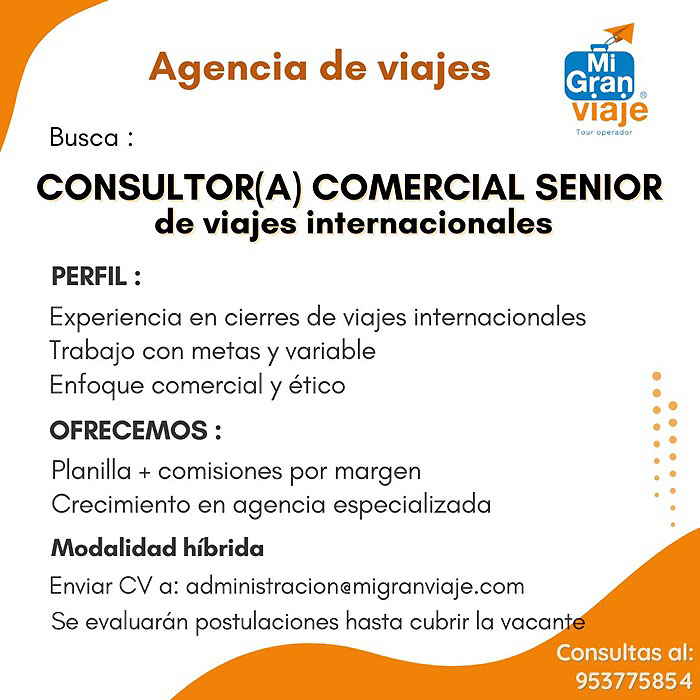 Las personas interesadas deben enviar su CV documentado al correo: administracion@migranviaje.com | Teléfono de contacto: 953 775 854