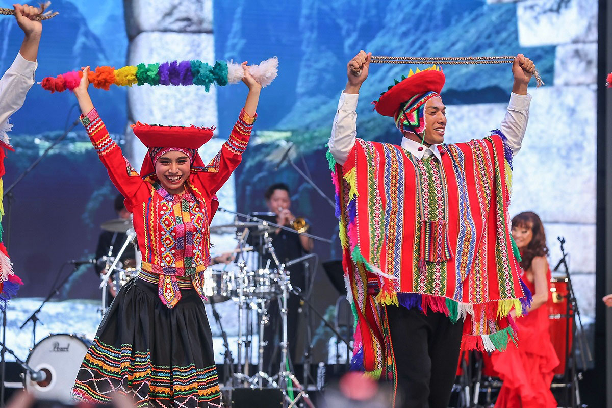 Un vibrante pasacalle recorrió el anillo de madera de la Expo, como parte central de las celebraciones. La presentación estuvo a cargo del Ballet Folclórico Nacional del Perú, que desplegó una comitiva de 30 danzantes luciendo trajes típicos tradicionales adornados con wichis (pompones peruanos utilizados en vestuario festivo).
