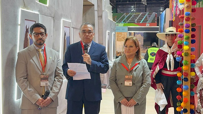 El Embajador del Perú en Argentina, Carlos Chocano Burga, inauguró el stand de PromPerú en la FIT 2025. Estuvo acompañado de Silvia Seperack, consejera económico comercial de PromPerú.