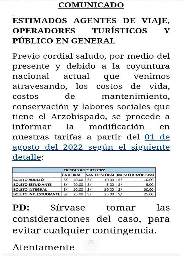 “La diferencia tarifaria no la pagaría el turista, pues ya se tiene pactado el precio y aplicar diferencias fuera de ella puede ser sujeto de sanción de Indecopi”, explicó la AATC, en un documento enviado al Arzobispado el pasado 25 de julio.