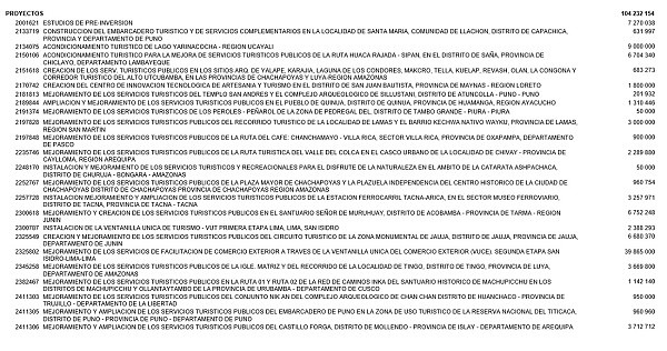 El presupuesto destinado a la ejecución de proyectos turísticos este año llega a S/ 104,232,154, lo que significa un incremento de 11% con respecto al año pasado cuando la inversión fue de S/ 93,736,536. El plan de inversión para el 2020 es el siguiente: