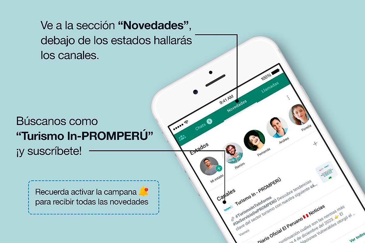 Todos los interesados en unirse al canal Turismo In – PROMPERÚ pueden buscarlo con ese nombre en el directorio de WhatsApp (sección Novedades de la aplicación) o pueden hacer clic en el siguiente enlace: https://bit.ly/WAcanaltin
