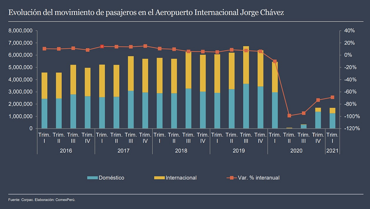 En el Aeropuerto Internacional Jorge Chávez (Lima) se movilizaron 1.7 millones de pasajeros durante el primer trimestre de 2021, un 68.9% menos de lo registrado en similar período del año anterior. Las llegadas y salidas en vuelos nacionales representaron el 73.6% de las movilizaciones en dicho período.