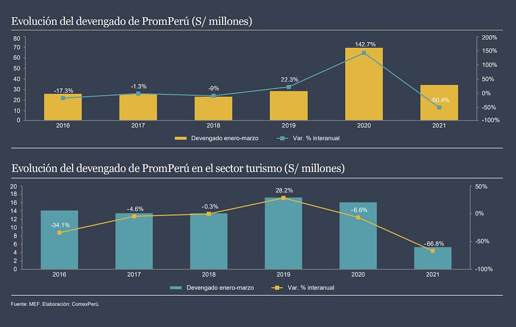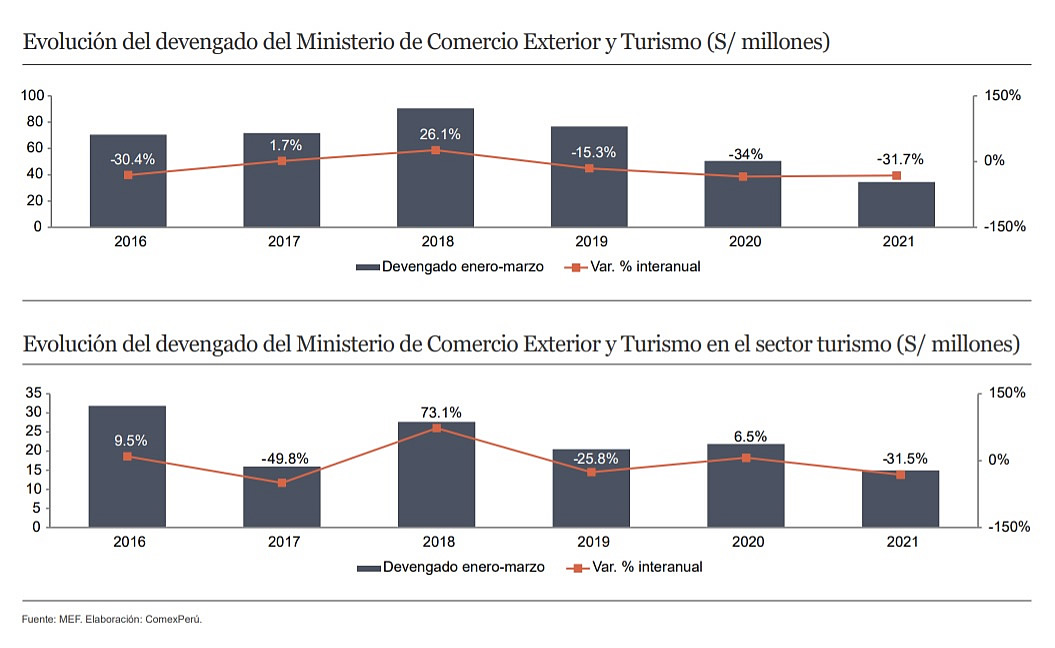 Específicamente para el sector Turismo, PromPerú dedicó S/ 5 millones durante los primeros tres meses de 2021 (-66.8%). Para la función turismo, se ejecutó 81% menos que en el cuarto trimestre de 2020, indica el documento gremial.