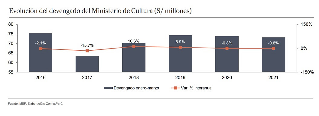 Respecto al Ministerio de Cultura, este gastó S/ 73 millones durante el período enero – marzo de 2021, un 0.8% menos que lo ejecutado en el mismo período en 2020. En el primer trimestre, se ejecutó 65.4% menos de lo registrado en el cuarto trimestre en 2020.
