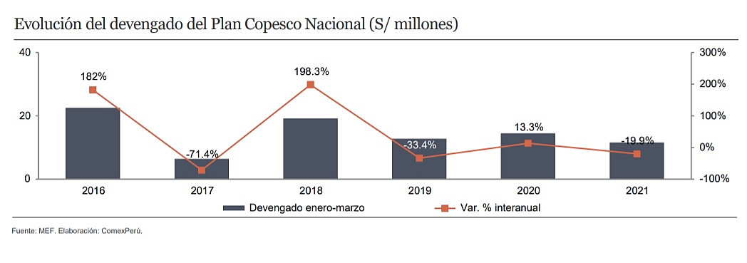 Durante el período enero – marzo de 2021, el Plan Copesco Nacional ejecutó S/ 12 millones, un 19.9% menos que en el período enero-marzo de 2020. Por otro lado, en el primer trimestre, la caída fue más profunda respecto al cuarto trimestre de 2020, con una menor ejecución de 49%.