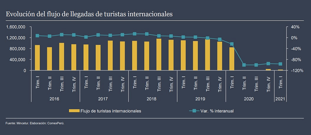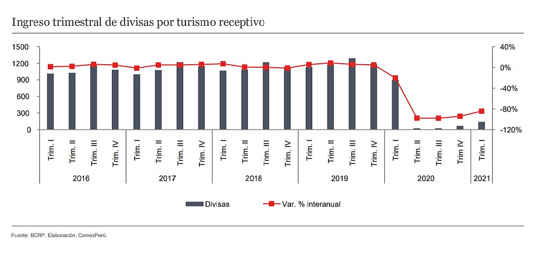 “Históricamente hasta 2020, el primer trimestre del año se ha caracterizado por registrar montos superiores a US$ 580 millones por ingreso de divisas por turismo receptivo; no obstante, debido a la crisis causada por el Covid-19, dicho monto ha caído por debajo del mínimo y la media histórica”, señala el informe de ComexPerú.