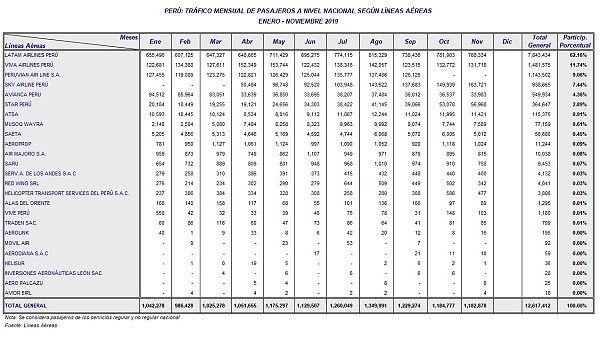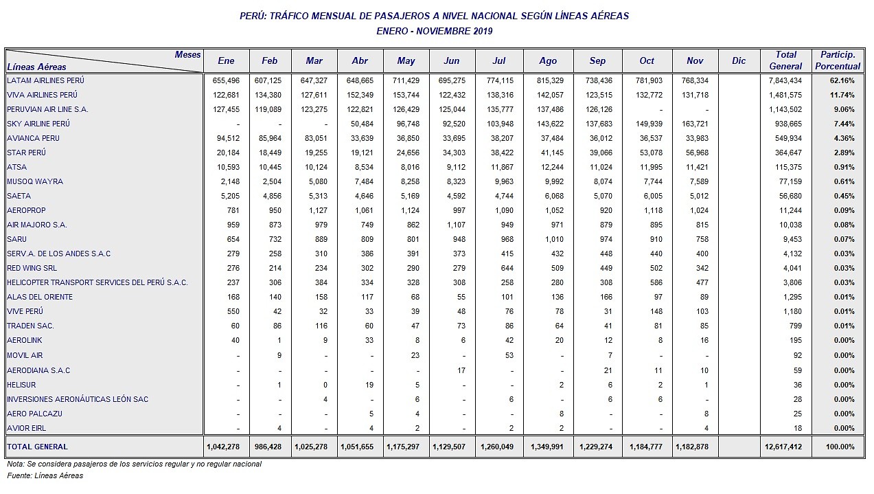 De enero a noviembre de 2019, Latam Airlines Perú tuvo la más alta participación dentro del tráfico aéreo nacional al transportar 7,843,434 pasajeros, lo que representó el 62.2% del mercado nacional; seguido por Viva Airlines Perú con 1 481 575 pasajeros (11.7%), Peruvian Airlines con 1,143,502 pasajeros, que representó el 9.1% (operó hasta septiembre de 2019), Sky Airline Perú con 938,665 pasajeros lo que representó el 7.4% (viene operando desde el mes de abril de 2019), Avianca Perú con 549,934 pasajeros (4.4%) y Star Perú con 364,647 pasajeros (2.9%).