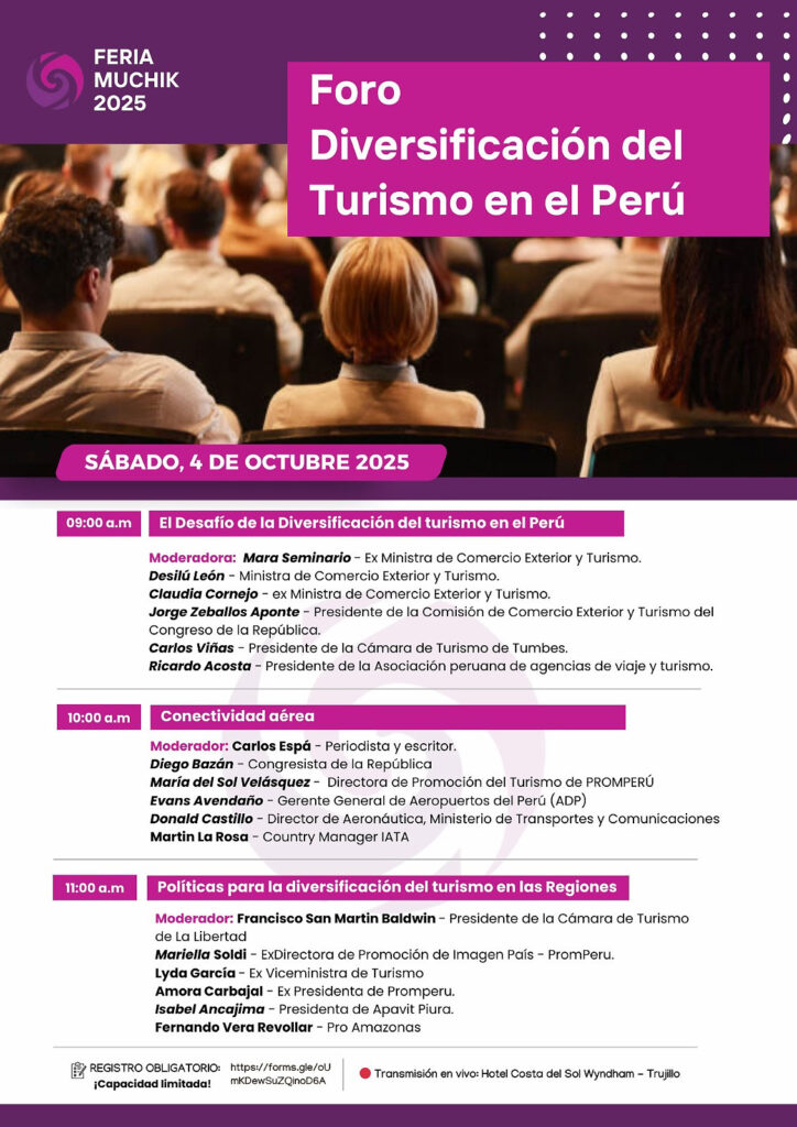 La jornada central se llevará a cabo mañana, sábado 4 de octubre, con el Foro “Diversificación del Turismo en el Perú”, que reunirá a destacadas personalidades del sector público y privado. El programa se iniciará a las 9:00 a.m. con el bloque “El Desafío de la Diversificación del Turismo en el Perú”, moderado por la exministra de Comercio Exterior y Turismo Mara Seminario. Participarán la actual ministra de Comercio Exterior y Turismo, Desilú León; la exministra Claudia Cornejo; el presidente de la Comisión de Comercio Exterior y Turismo del Congreso, Jorge Zeballos Aponte; el presidente de la Cámara de Turismo de Tumbes, Carlos Viñas; y el presidente de la Asociación Peruana de Agencias de Viaje y Turismo (Apavit), Ricardo Acosta.