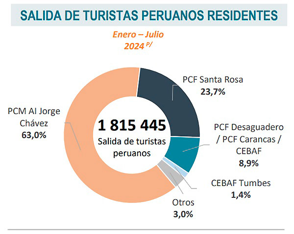 El 63% de turistas peruanos residentes, registró su salida del país por el Aeropuerto Internacional Jorge Chávez, mientras que el 23,7% lo realizó por el Puesto de Control Fronterizo Santa Rosa en Tacna.