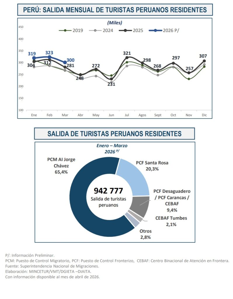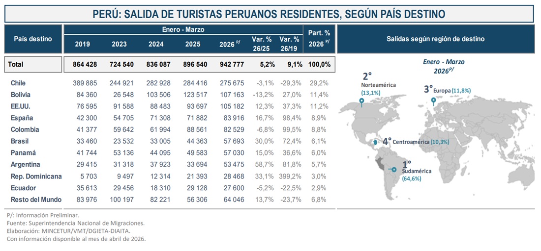 El Ministerio de Comercio Exterior y Turismo (Mincetur) informó que entre enero y marzo de 2026 salieron del país 942 777 turistas peruanos residentes, lo que representó un crecimiento interanual de 5,2%. Asimismo, la cifra superó en 9,1% los niveles registrados en el mismo periodo de 2019, previo a la pandemia.