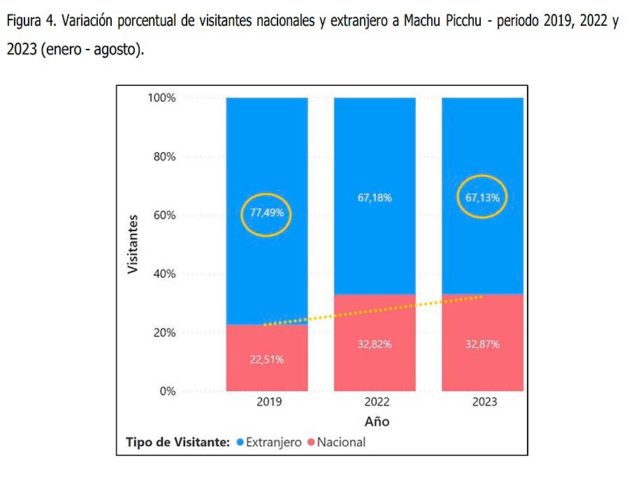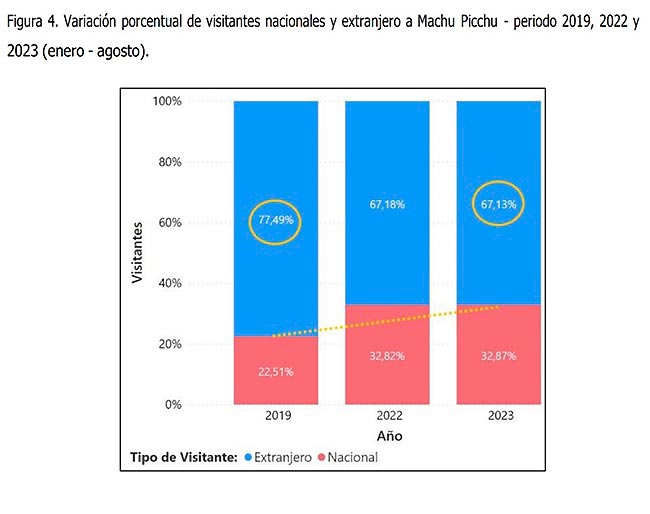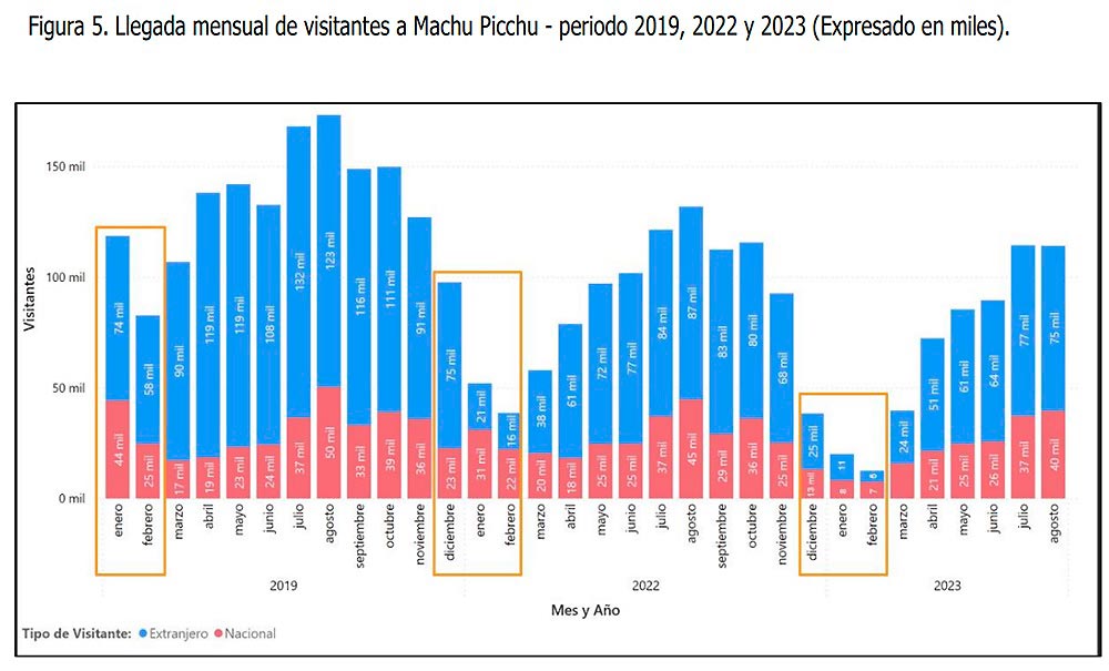 La maravilla mundial ha sufrido un duro revés en torno al número de visitantes que recibió en el periodo analizado. Las operaciones ferroviarias y el acceso a la Llaqta de Machu Picchu sufrieron varias interrupciones durante este tiempo. Adicionalmente a ello, decisiones políticas bastante cuestionables, como la venta de boletos de manera presencial, aumentaron la dificultad de conseguir entradas a los visitantes repercutiendo negativamente.
