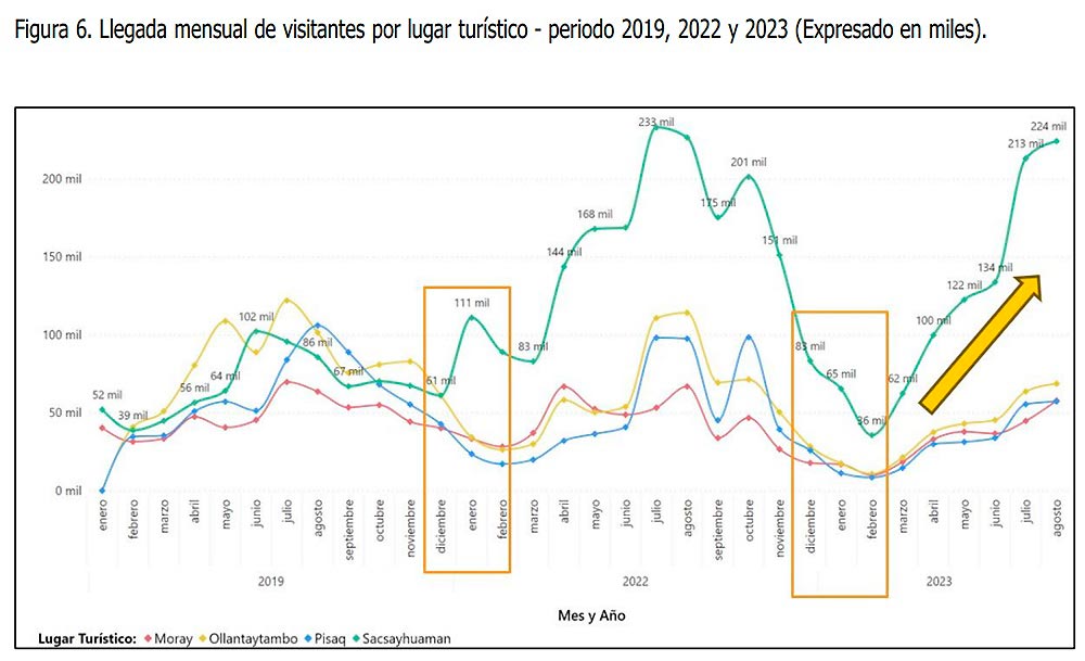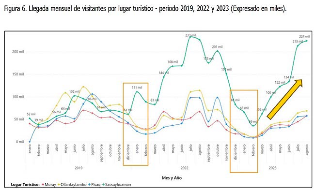 Un comportamiento particular es el de Sacsayhuaman, cuya cantidad de visitantes en diciembre 2022 y enero 2023 es superior inclusive a los niveles prepandemia. Es más, la cifra total que reporta este atractivo hasta agosto 2023 es superior a la de Machu Picchu en 407,652 visitantes.