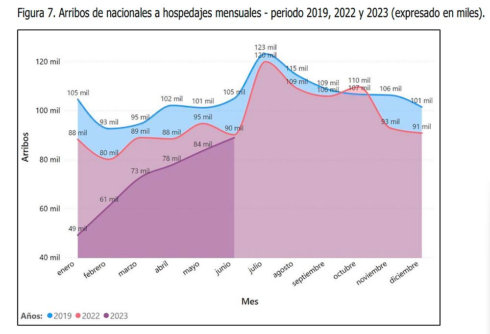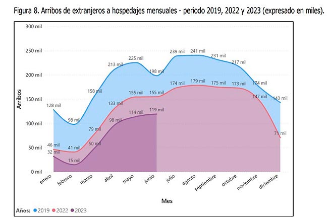 Un tercer indicador relevante para ver los efectos de los conflictos se encuentra en la cantidad de arribos a hospedajes en la región. Se aprecia claramente una disminución de las cifras en 2023 comparándolas con el periodo prepandemia (2019) e inclusive con lo consignado en 2022.