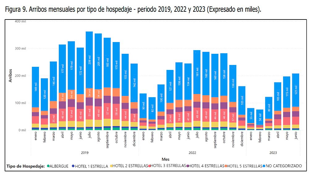 En todas las categorías de hospedaje existe una disminución considerable en la cantidad de arribos, cuyos valores más extremos se hicieron presentes en enero y febrero 2023, mostrando una vez más el fuerte impacto de las movilizaciones y demás medidas vividas producto del intento de golpe de Estado del expresidente Castillo.