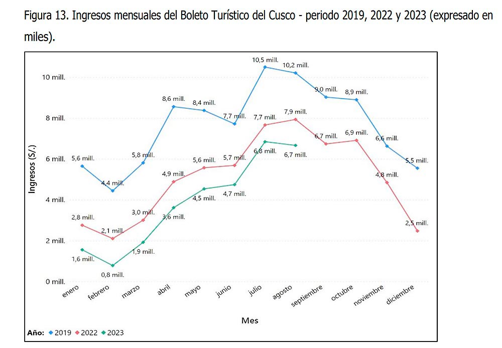Según reportes de Cosituc, los ingresos por la venta del Boleto Turístico durante los primeros ocho meses de 2023, comparándolos con el mismo periodo en 2019, se dejó de percibir por este concepto un poco más S/ 30,572,760.